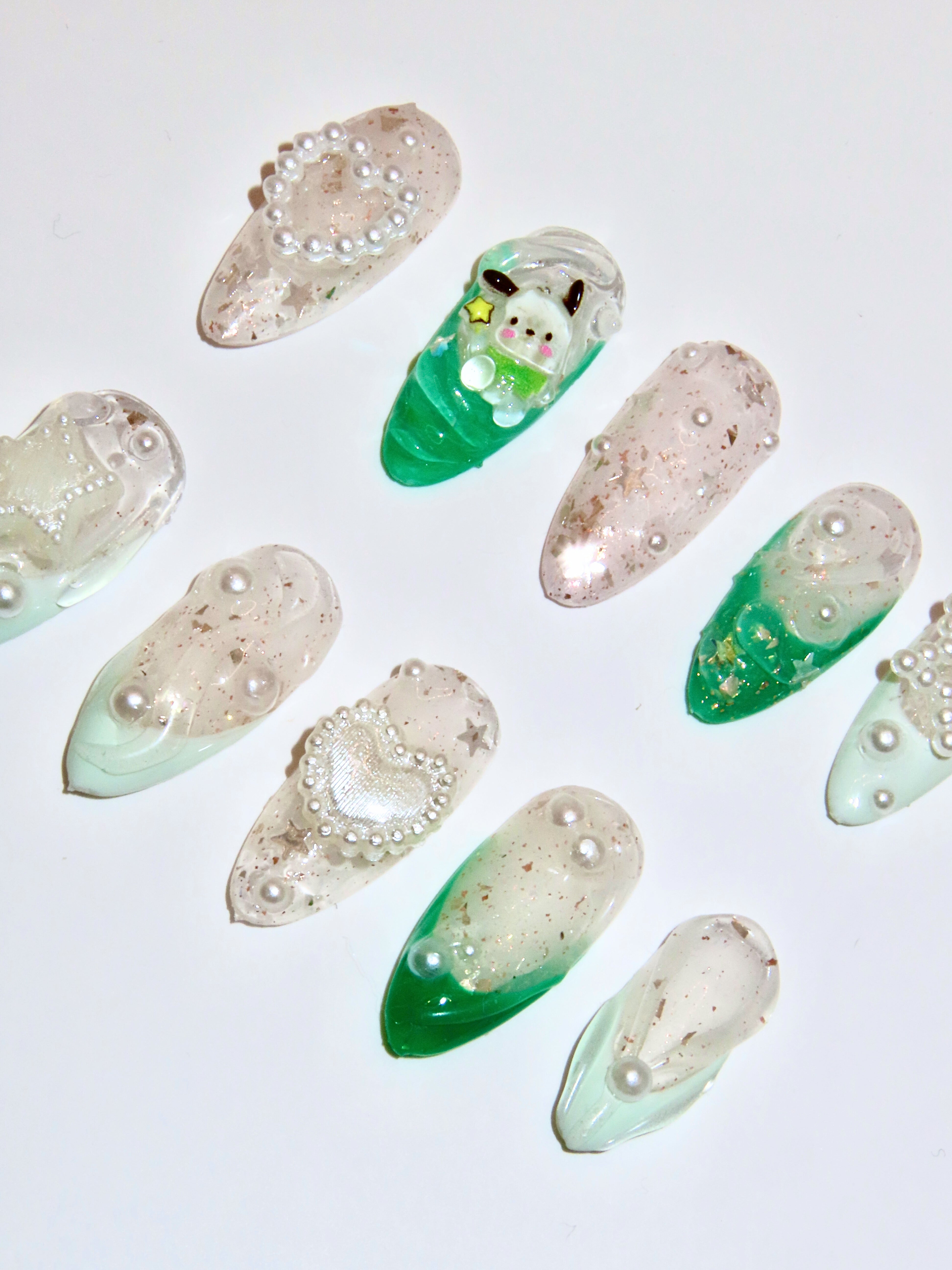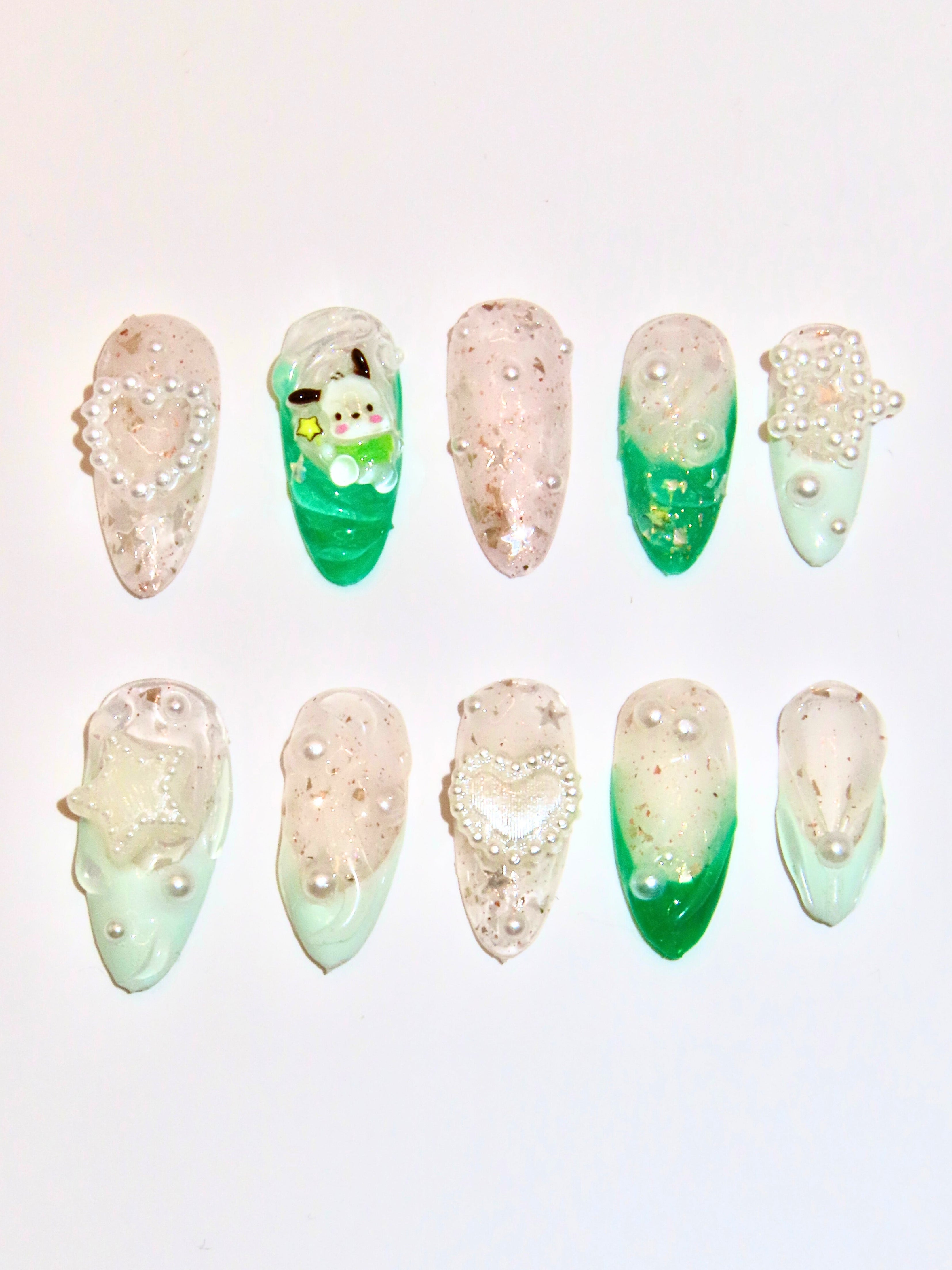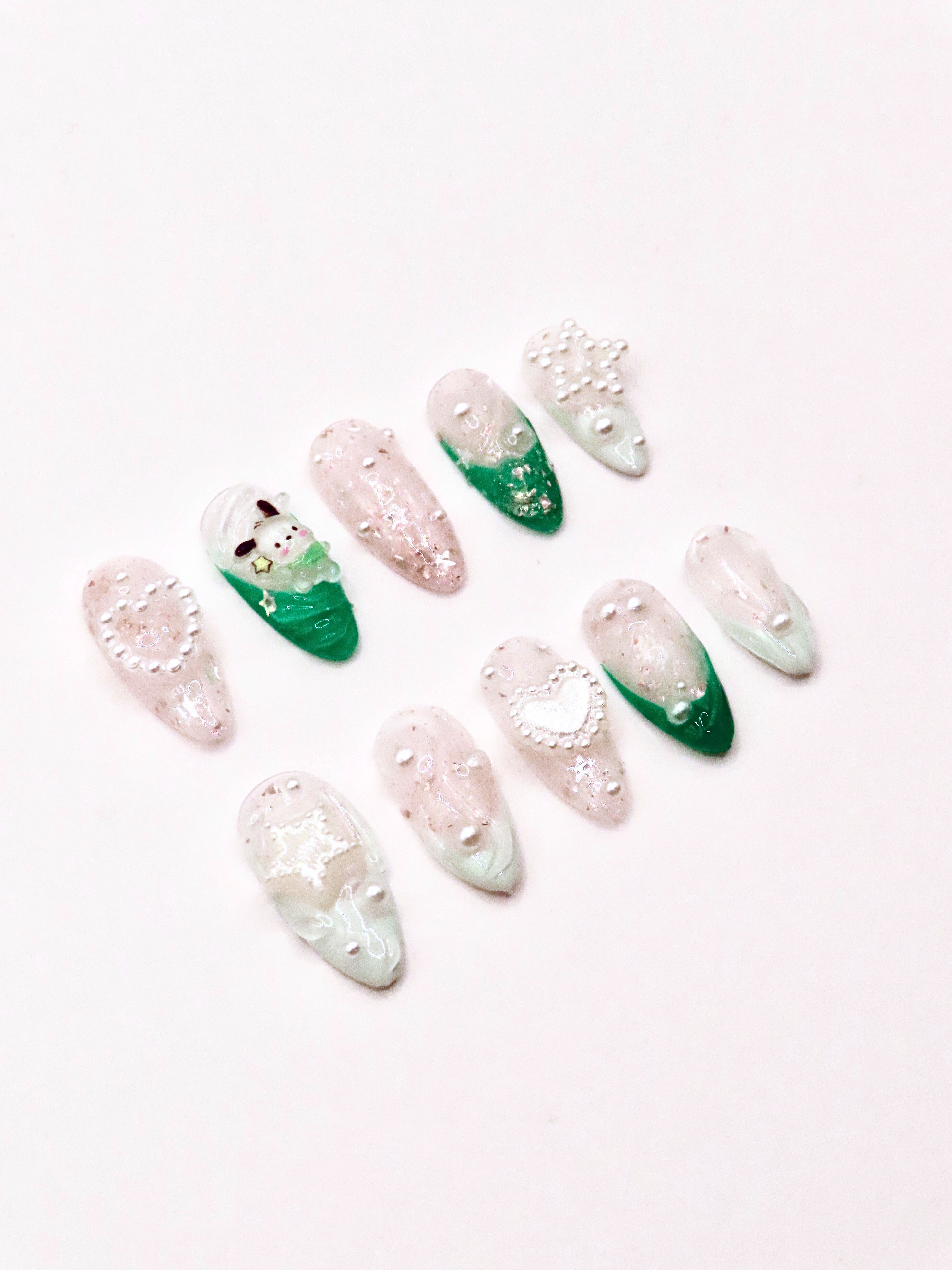 Bring playful charm to your nails with "Chasing Pochacco," featuring green French tips highlighted by sparkling glitter. This cute and fun design celebrates the beloved Pochacco character, adding a joyful and unique flair to your nails. Perfect for expressing your vibrant personality with every gesture.