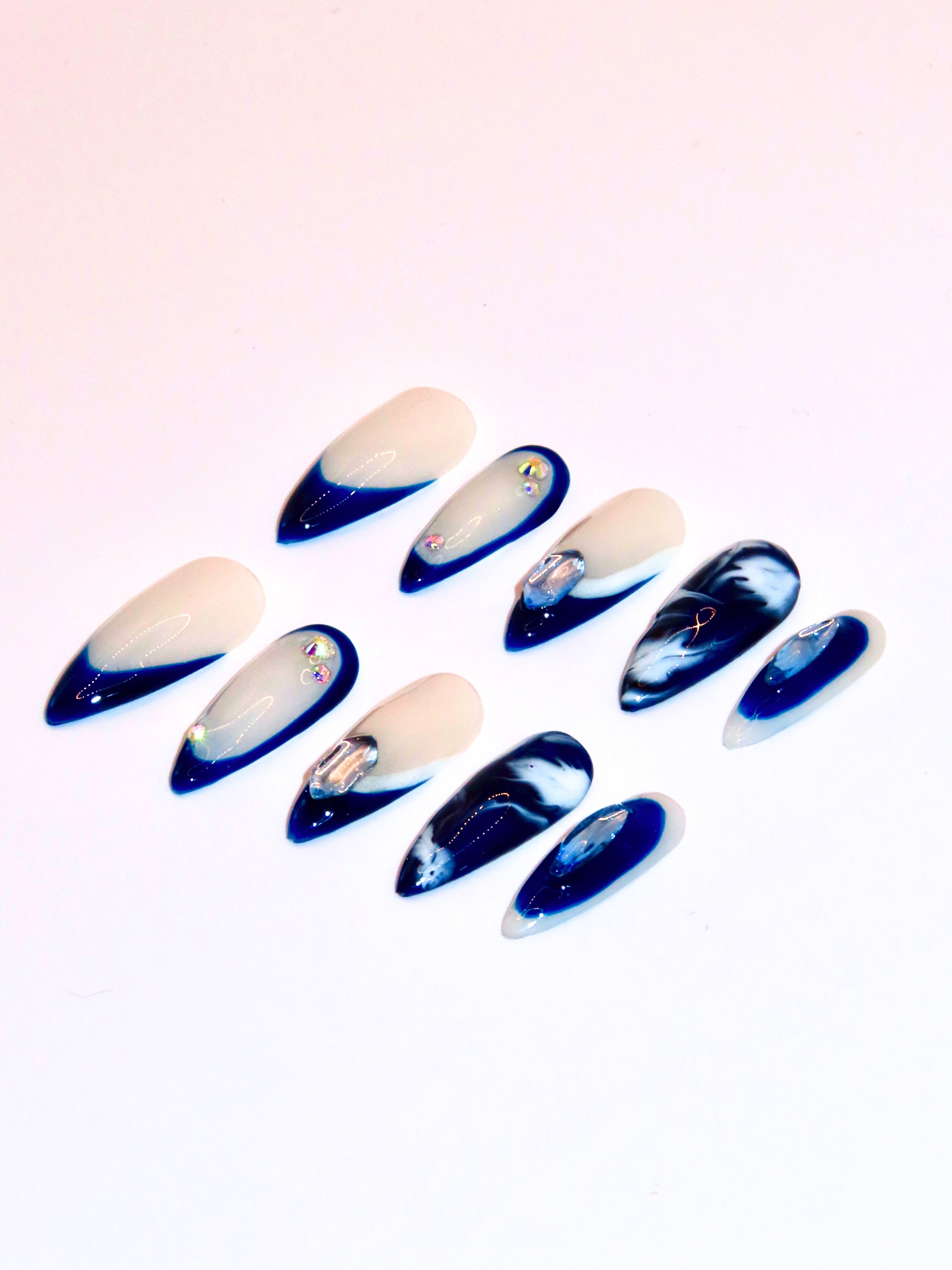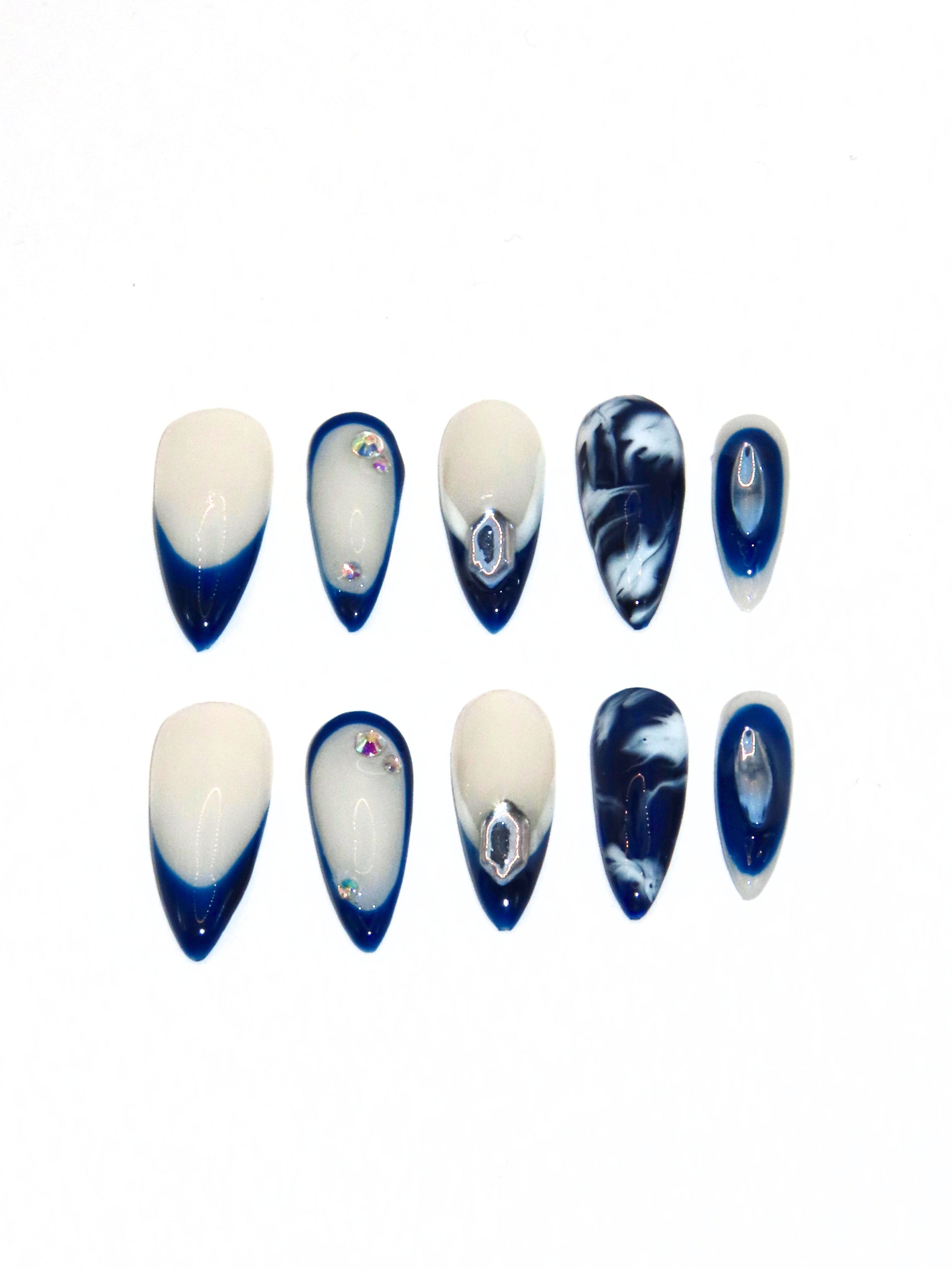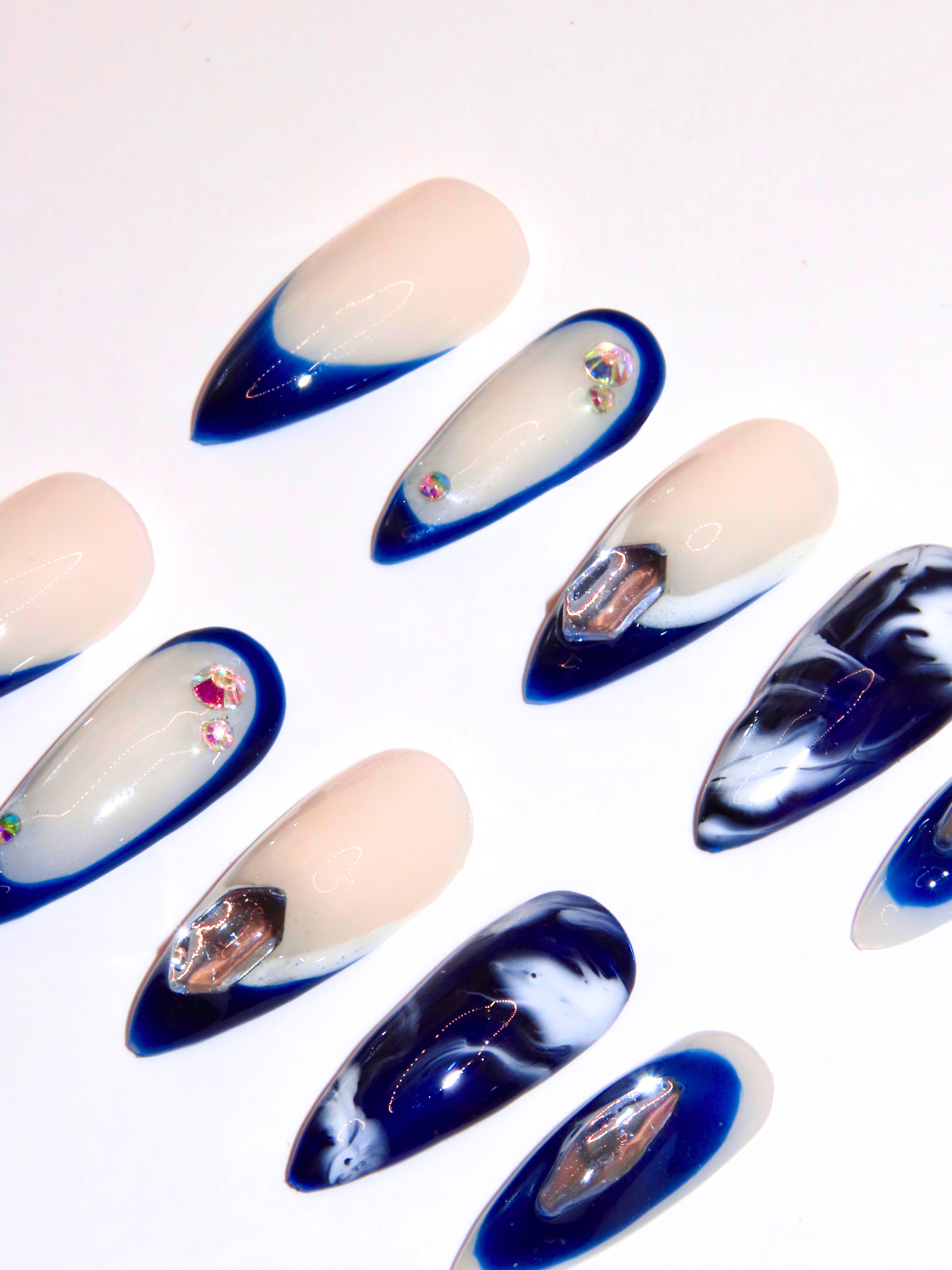 Experience elegance with Glint, featuring vivid blue French tips accented by sparkling diamantes. This design combines blooming art for a fresh, sophisticated look that's both clean and classy, perfect for making a subtle yet striking statement.