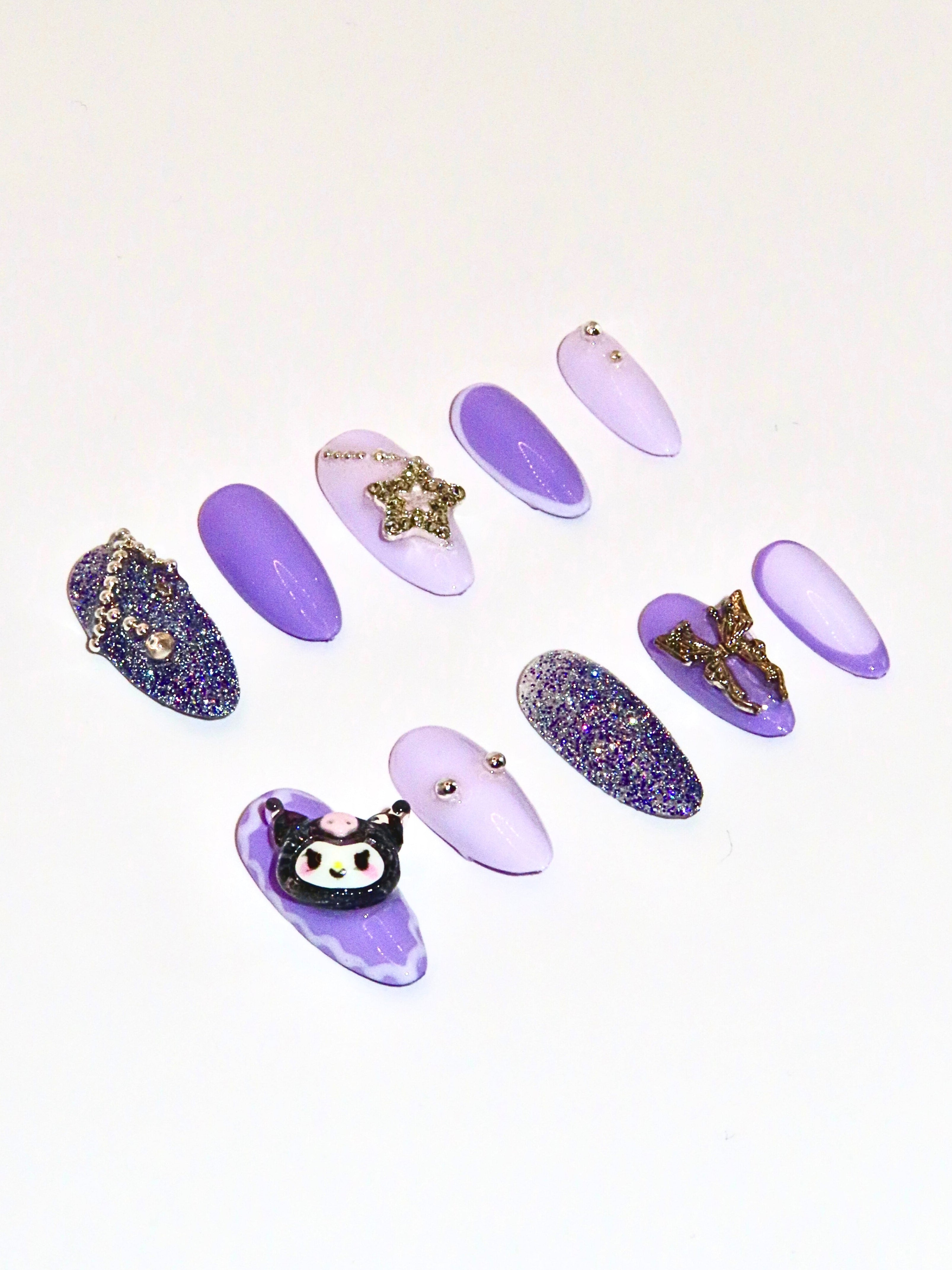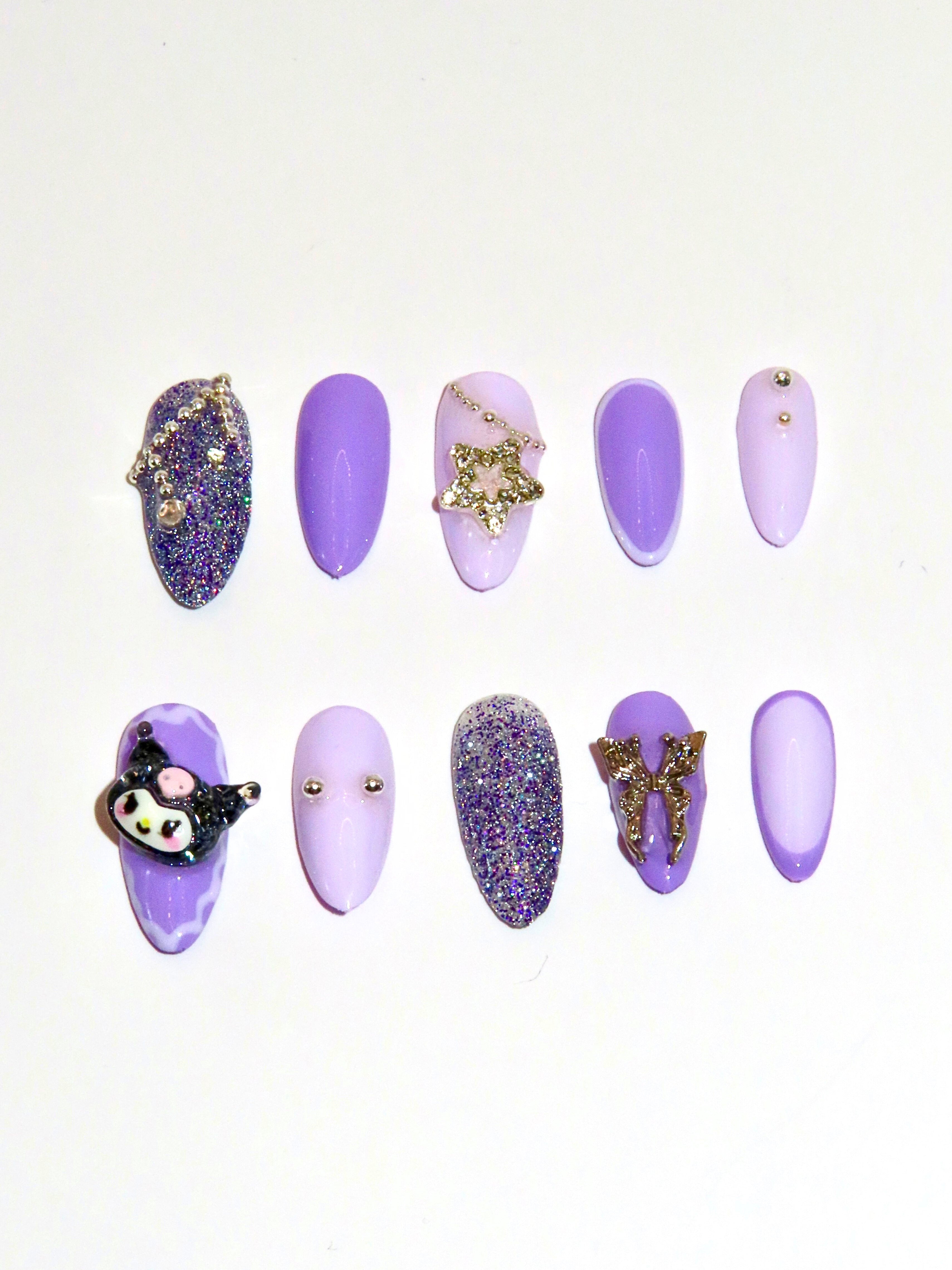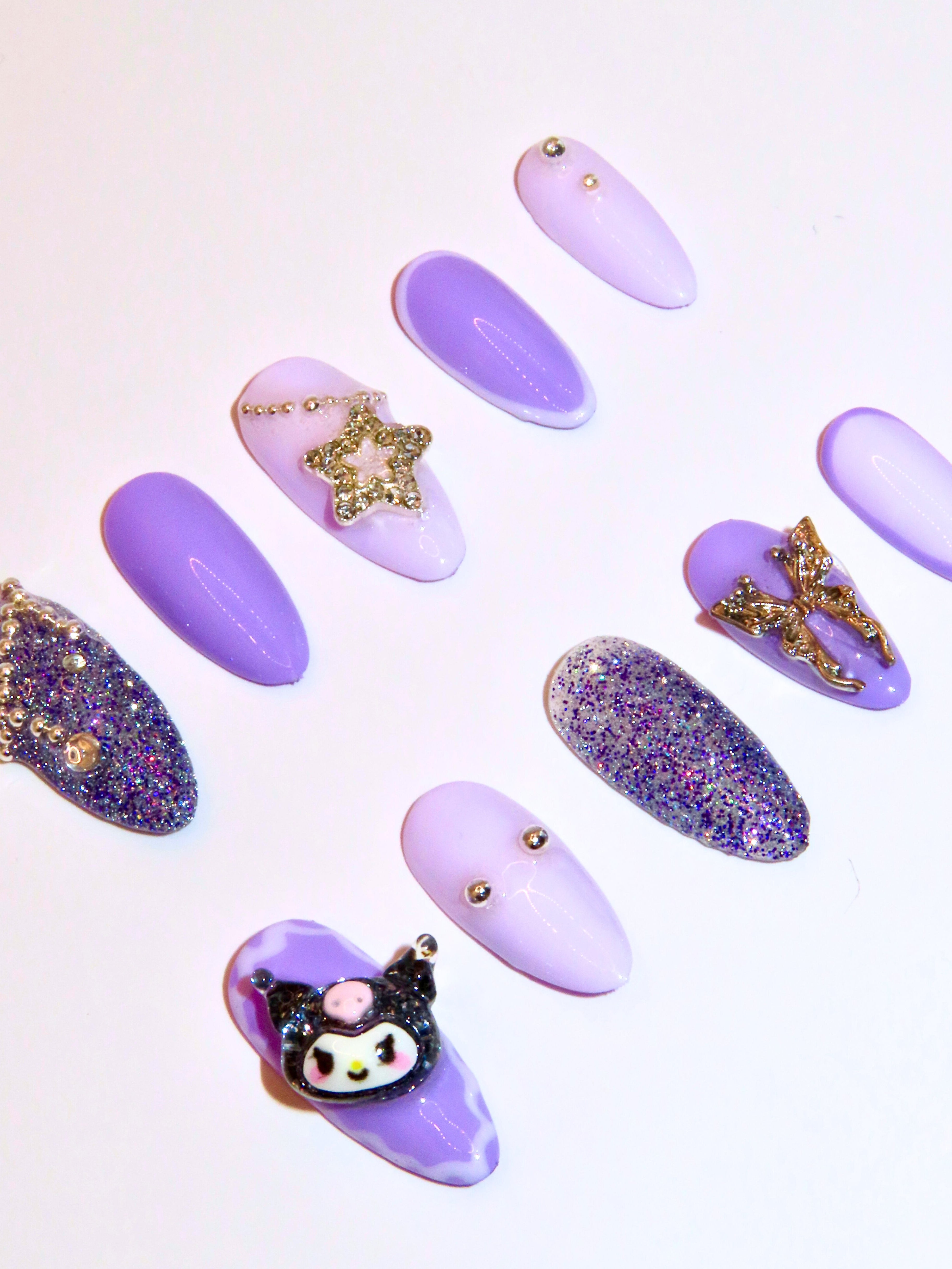 Soft shades of lavender and purple blend with sparkling sugar-glitter highlights, and silver studs. The look is completed by a 3D Kuromi charm, a star-chain detail, and a silver butterfly, perfectly capturing a sweet yet edgy goth-cute style.